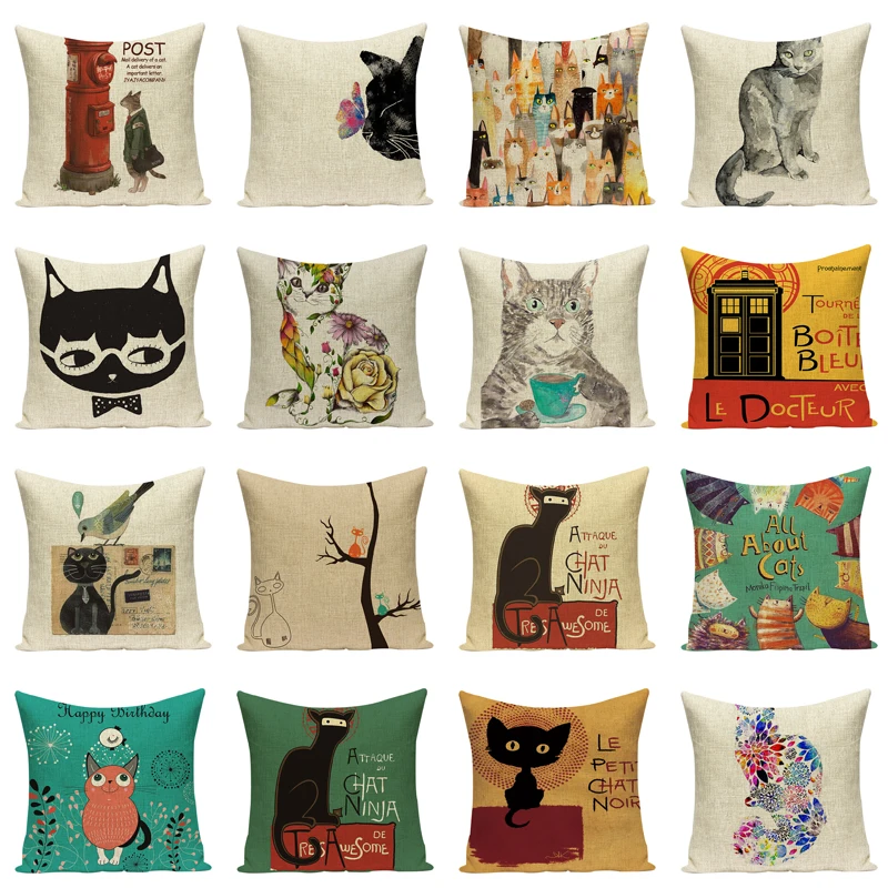 معرض ل أفضل بيع الكرتون لطيف القط غطاء من الكتان للوسائد 45X45 سنتيمتر المخدة مكتب المنزل الديكور المخدة أريكة Cojines